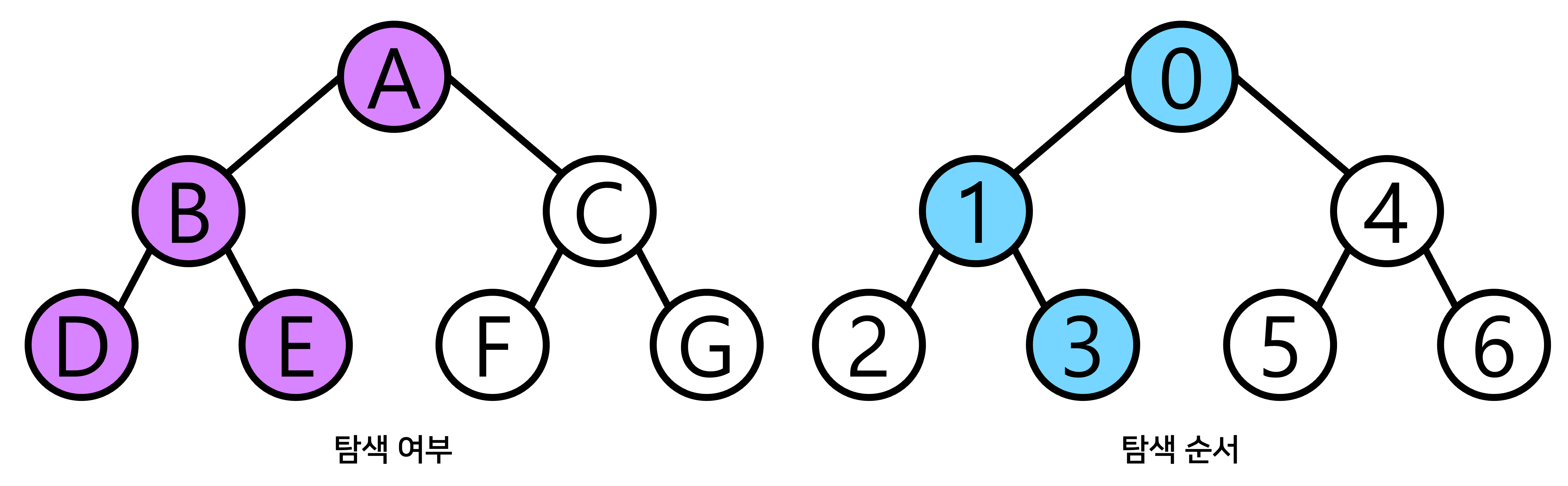 이제 B 노드의 근접 노드를 생각해보자. A는 이미 접근한 노드이기 때문에 제외한다. D와 E 사이에서 하나를 선택해야 한다. 죄에서 우 순서로 진행하기로 했으니 D에 접근하도록 하겠다.