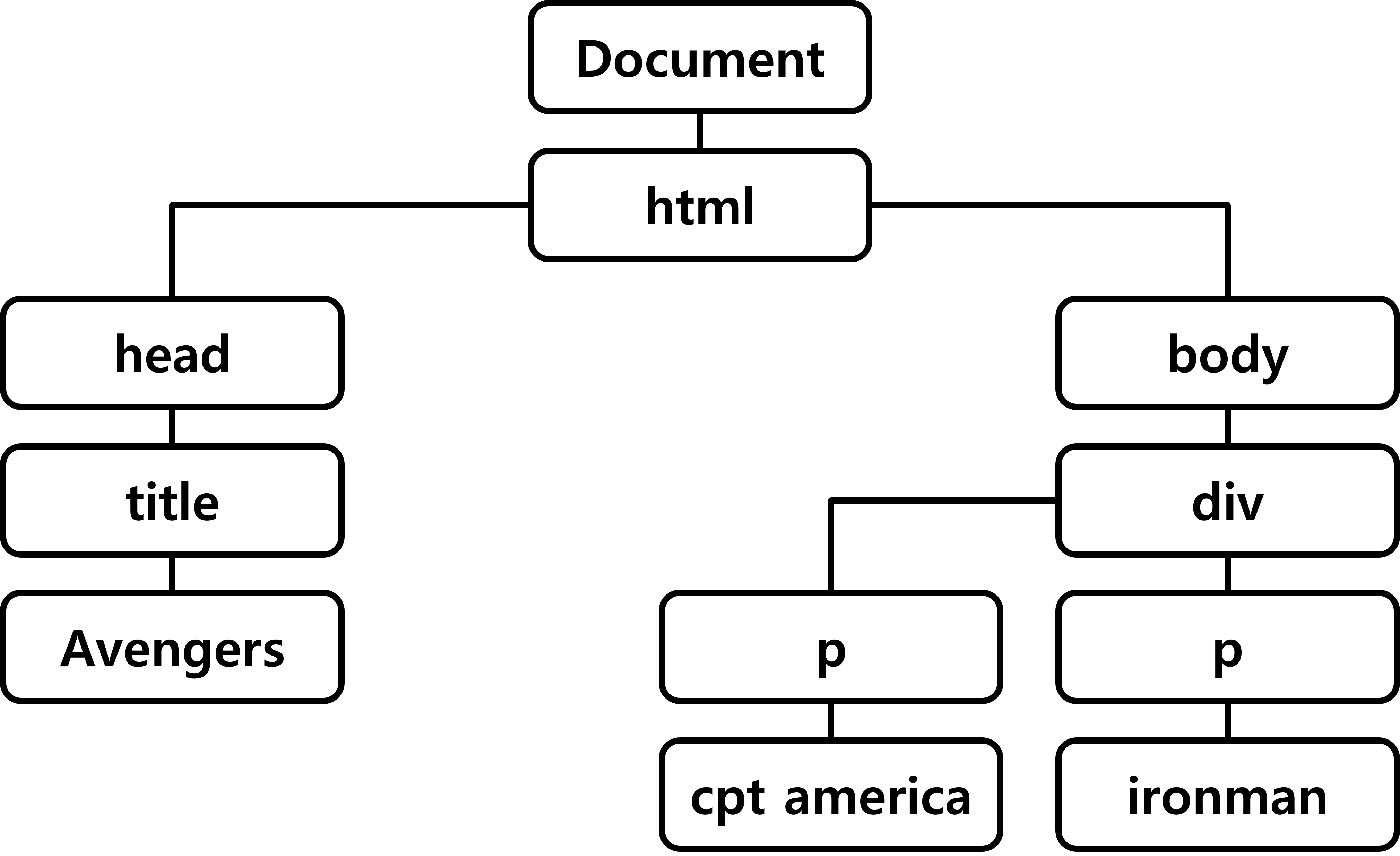 <!DOCTYPE html> <html lang="en"> <head> <title>Avengers</title> </head> <body> <div> <p>cpt america</p> <p>ironman</p> </div> </body> </html>위와 같은 HTML 태그가 있다고 하자. 이 태그들은 지금은 그저 텍스트에 불과하다. 이를 빌드해 DOM으로 변환해보자.