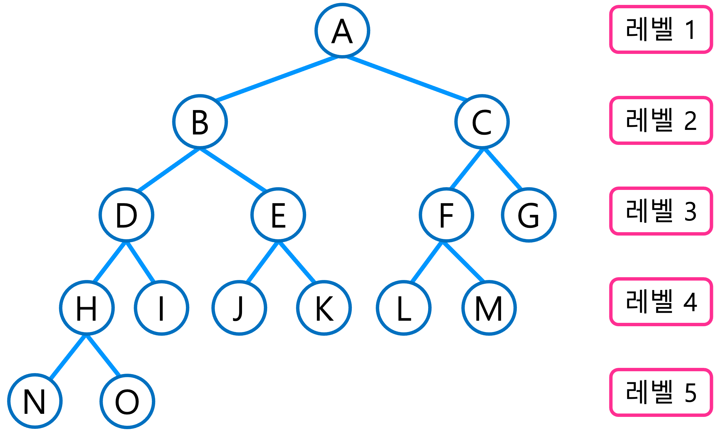 루트에서 어떤 노드에 도달하기 위해 거쳐야 하는 간선의 수(L의 깊이 3, O의 깊이 4 등) - 노드의 레벨(level)