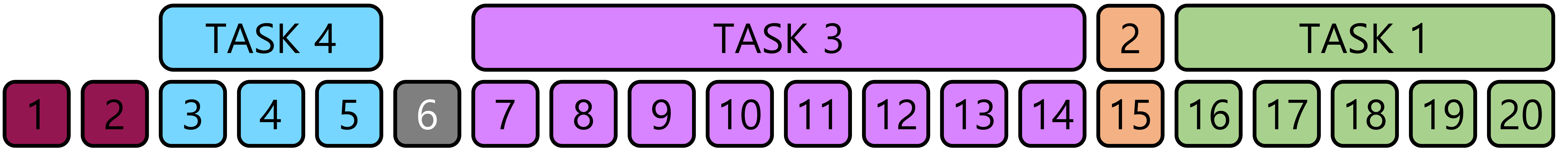 그림으로 표현하면 이렇다. 첫 번째 일(TASK 1)은 20부터 5의 시간이 드니 15의 시간이 남는다. 두 번째 일은 1의 시간이 들어서 14의 시간이 남고, 세 번째 일은 8의 시간이 들기 때문에 6의 시간이 남는다. 6까지 여유가 되지만 마지막 일은 5에서 끝나야 한다. 때문에 5에서 마지막 일이 걸리는 시간 3을 빼면 2가 남고 이게 답이 된다.